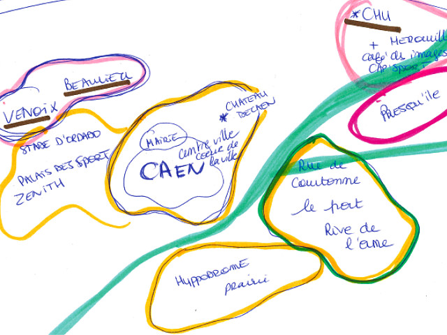 Une carte mentale géographique est un dessin réalisé librement sur une feuille de papier blanche par une personne pour représenter un lieu donné. Il s’agit d’une carte personnelle, subjective, déformée par rapport à la réalité, qui exprime le ressenti et les liens affectifs tissés avec le territoire. Pour un même lieu, une diversité de cartes mentales existe, en fonction de l’âge des personnes, de leur catégorie sociale, de leur lieu de résidence, de leurs déplacements, de leur imaginaire, etc. A quoi ressemble Caen et son agglomération vues par le prisme des cartes mentales ? Que révèlent les différences entre l’espace réel et l’espace dessiné ?