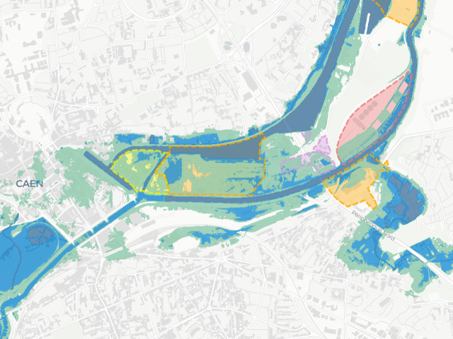 Les zones de contact entre l’eau et la ville font l’objet d’un engouement important à l’échelle mondiale. Appelés fronts d’eau, ces espaces sont à forts enjeux économiques, culturels, sociaux et symboliques. De ce point de vue, Caen possède un atout indéniable puisque deux voies d’eau, le canal et l’Orne, relient le centre-ville à la mer, délimitant ainsi ce que l’on appelle la Presqu’île. Au cours des décennies à venir, environ 300 ha de friches industrielles sont susceptibles d’être urbanisés pour un potentiel de milliers de logements : une aubaine historique pour transformer la ville et faire face à la crise du logement. Mais les perspectives du changement climatique questionnent ces aménagements et sont sources d’incertitude depuis 2023.